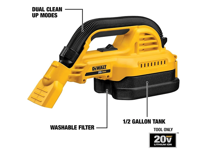 Dewalt DCV517, aspiradora inalámbrica seco/húmedo 20 V MAX con filtro HEPA lavable, tanque de 1,9 litros y manguera flexible, solución portátil y potente para limpieza profesional en obra, vehículos y mantenimiento, Dewalt Chile.