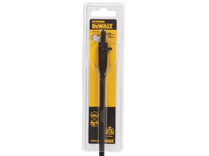 Dewalt DT4781-QZ – Broca Paleta Madera Plana 12 mm × 406 mm Extreme Flatbit con Vástago Hexagonal, Punta Rectificada y Bordes Biselados para Perforación Rápida y Precisa en Madera Natural y Compuesta