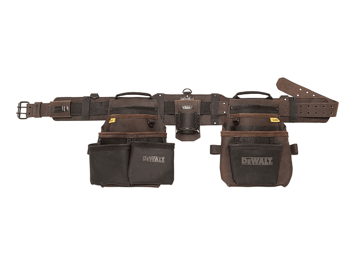Dewalt DWST550113, cinturón porta herramientas de cuero nobuck con 18 bolsillos, clip para huincha, anillos en D y diseño ergonómico acolchado, accesorio resistente y cómodo para organización profesional en obra, Dewalt Chile.