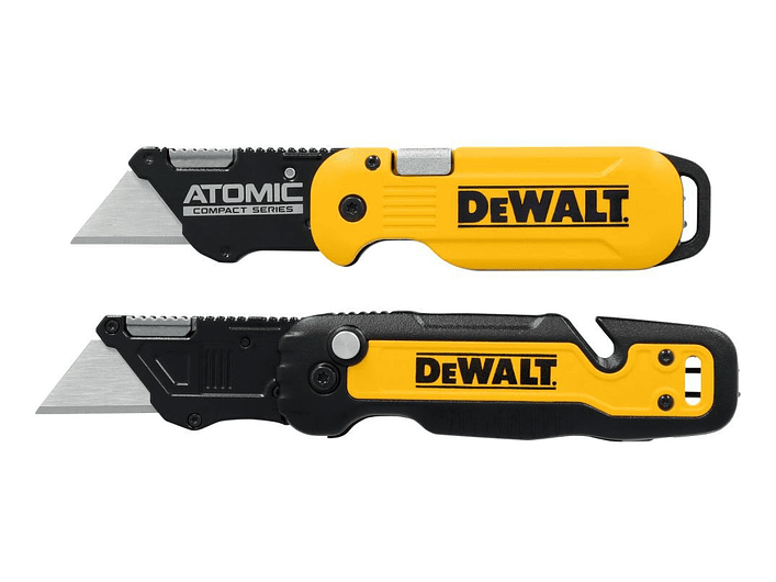 Dewalt DWHT10995 – Pack de 2 Cuchillos Cartoneros Plegables con Apertura Rápida Push & Flip, Hoja Reemplazable, Mango Ergonómico, Almacenamiento Interno y Diseño Compacto ATOMIC para Corte Preciso en Cartón, Cinta y Materiales Livianos