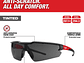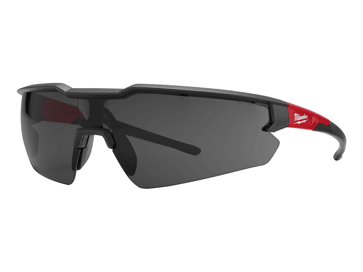 Milwaukee 48-73-2015, lentes de seguridad oscuros con capa antirrayas, puente nasal flexible, patillas acolchadas y certificación ANSI Z87.1+, protección ocular cómoda y resistente para uso profesional en obra y taller, Milwaukee Chile.