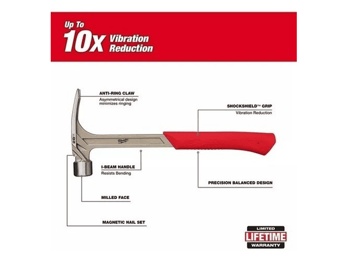 Diseñado para ofrecer máxima potencia, control ergonómico y resistencia industrial, este martillo Milwaukee es ideal para trabajos de encuadre, estructuras y carpintería pesada. Su mango con tecnología SHOCKSHIELD™ reduce la vibración hasta 10 veces más que modelos convencionales, mientras que su diseño balanceado permite un swing fuerte y suave.