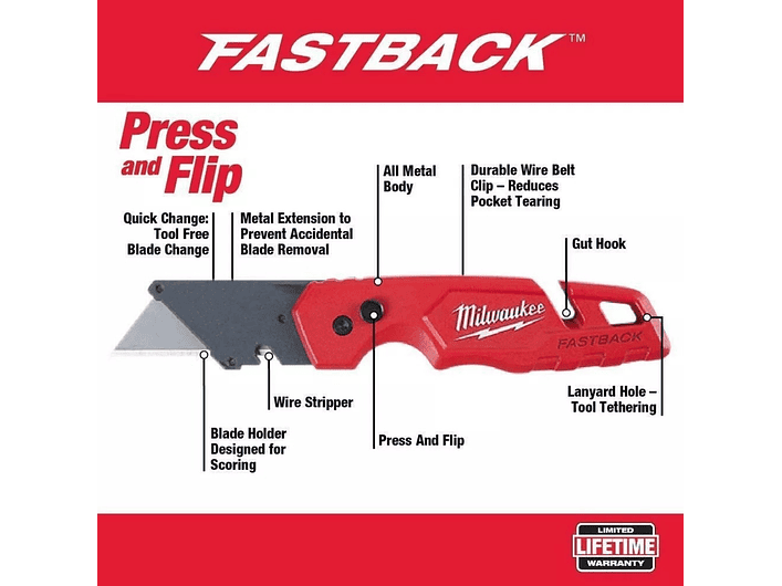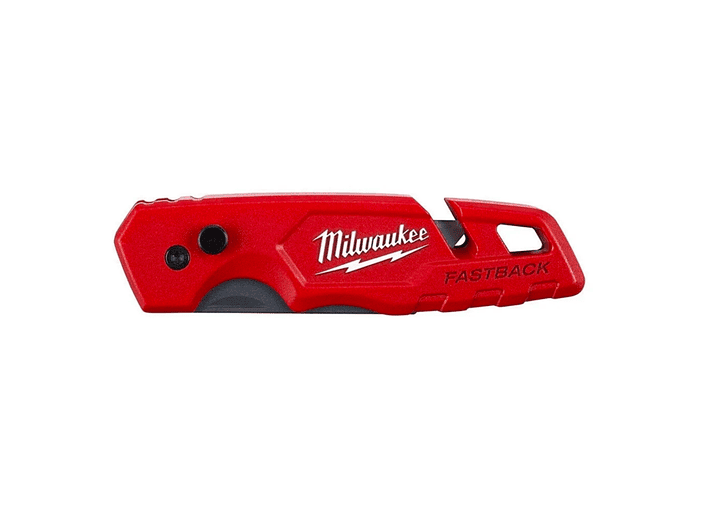 Milwaukee 48-22-1501, cuchillo cartonero plegable FASTBACK™ con apertura rápida, cambio de hoja sin herramientas, cuerpo metálico y pelacables integrado, herramienta versátil y resistente para cortes profesionales en obra, Milwaukee Chile.
