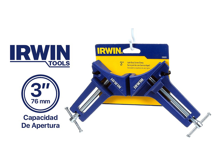 Irwin 226200, prensa esquinera metálica de 3" con tornillos de acero y almohadillas de nylon, herramienta precisa y liviana para ensambles en ángulo recto, Irwin Chile.
